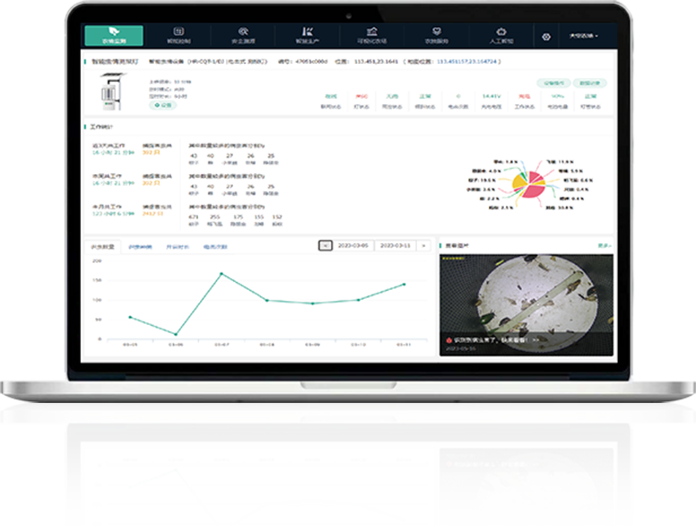 云平臺或APP上實時查看設備分布點位、工作狀態(tài)、電池電量等,進行功能設置等設備管理操作;可視化顯示害蟲圖片、種類數(shù)量、變化趨勢,智能分析蟲情報告,基于農業(yè)知識圖譜推薦蟲害防治方法。