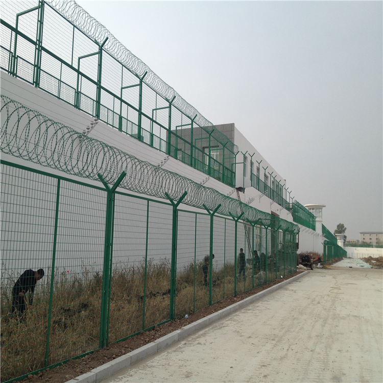 目前國內監獄、公安局戒毒所,看守所等所采用的鋼網墻一般為鐵絲焊接材質的,但是也夠設計要求是焊接刀刺網樣式的,簡單的說就是把直線的刀剌網焊接成我們需要的網孔,一般為菱形的最多,其他還有方形,長方形,再把焊接好的刀刺網四周焊接邊框,最后進行噴塑處理,這種處理和鐵絲焊接樣式的是不一樣的,鐵絲焊接樣式的一般都采用pvc浸塑處理,焊接刀剌網采用噴塑處理可以保證刀片原始的鋒利度,也可以有效的防銹防腐,相對于浸塑處理這種處理好的顏色會更加靚麗偏亮。