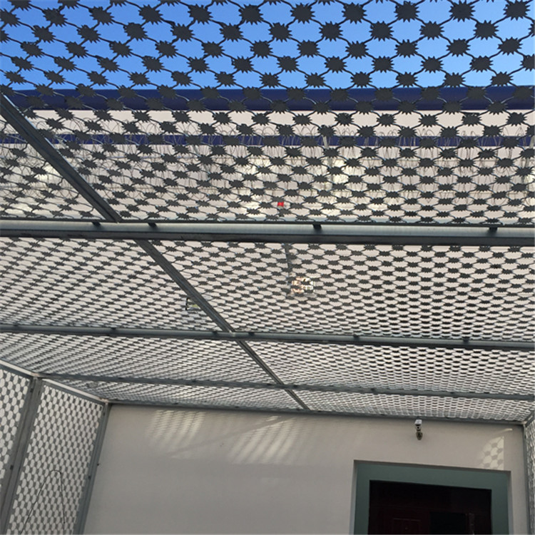 5、刀片滾網(wǎng)、拉絲、卡扣,均采用不銹鋼材質(zhì)。刀刺網(wǎng)安裝固定卡扣整體調(diào)正,使刀刺網(wǎng)不出現(xiàn)擰轉(zhuǎn)情況,刀刺刺圈分布均勻,每隔30-40cm與拉絲固定;分段連接處需將兩端刀刺網(wǎng)做連接固定,刀刺網(wǎng)固定點(diǎn)需緊鎖不得出現(xiàn)松動(dòng)、脫落現(xiàn)象;刀刺網(wǎng)安裝與隔離網(wǎng)平行,上下左右均成直線(xiàn)延伸,轉(zhuǎn)角處需做加密加固處理。