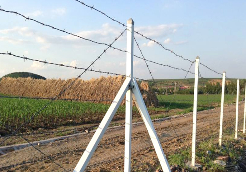 防爬刺絲剌網和立柱搭配使用效果好,每道刺絲刺網之間的間距一般為15- 25公分,高度1.8米,需要9道。農場畜牧業常用的是這種,中間的立柱我們采用方鋼或者是圓鋼使用。支撐立柱焊接固定鉤子,把防扒刺絲剌網固定上面,把勾子拍下去即可。這是常用做法。