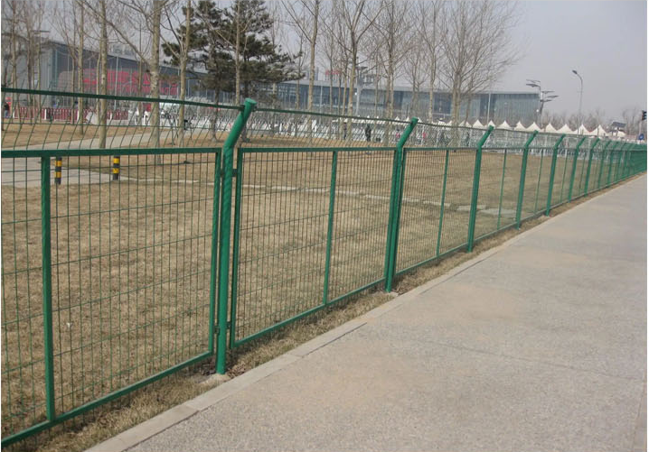 立柱采用方型冷拔鋼管,外邊長50mm ,壁厚4mm ,兩端加堵頭,埋深40cm。斜撐采用45x45x 4mm角鋼。網片采用φ4mm低碳鋼絲,間距7.5x15cm (寬x高) ,頂部以下30cm處向外折。網片框架為40x 4mm扁鋼。網片沿立柱中心線設置。