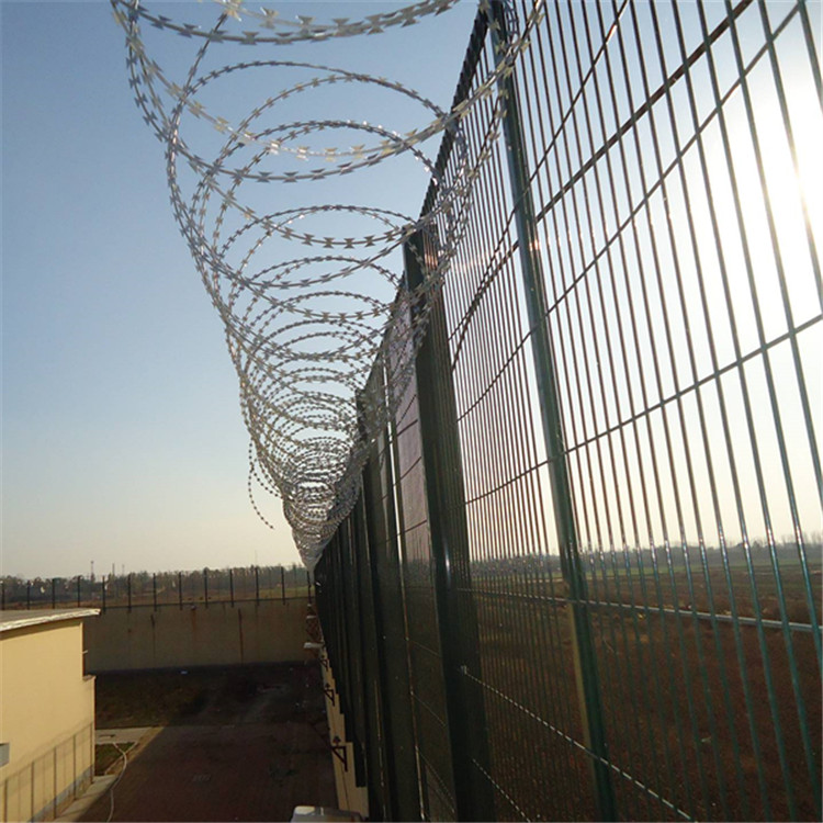 監獄鋼網墻是一種新型保護網,由刀片,刀尖,鋼絲交織而成。監獄鋼網墻有警戒的效果,原料強,強度高,張力高,防翻越,防爬等設計獨特的設計,使人不敢觸摸,所以它可以達到恐嚇的效果,更有良好的保護屏障影響。