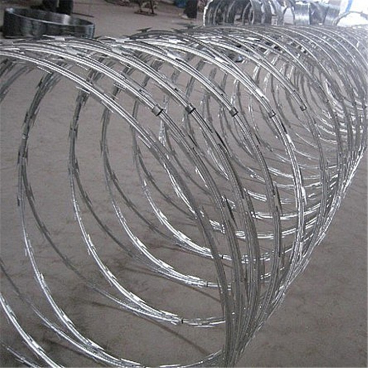 1、制作刀片:選用優(yōu)質(zhì)Q195L熱鍍鋅帶鋼(或者不銹鋼帶鋼),根據(jù)客戶選定的花型,經(jīng)高速?zèng)_床,沖軋成鋒利的刀片刺條,把刀片刺條纏成圓餅狀。