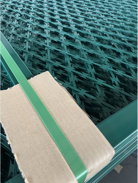 四,接下來就要焊接隔離網了。將焊接好的刀刺網按照施工圖紙對網面進行進一步處理,焊接好邊框和立柱后就可以進行表面處理了。