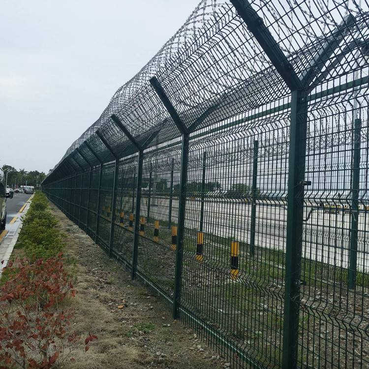 于機場周邊將機場與周邊農(nóng)田設(shè)施相隔離的金屬圍界網(wǎng),它是由立柱、網(wǎng)片、刺繩組成,一般表面采用浸塑或者噴塑處理用來防止腐蝕延長使用壽命。